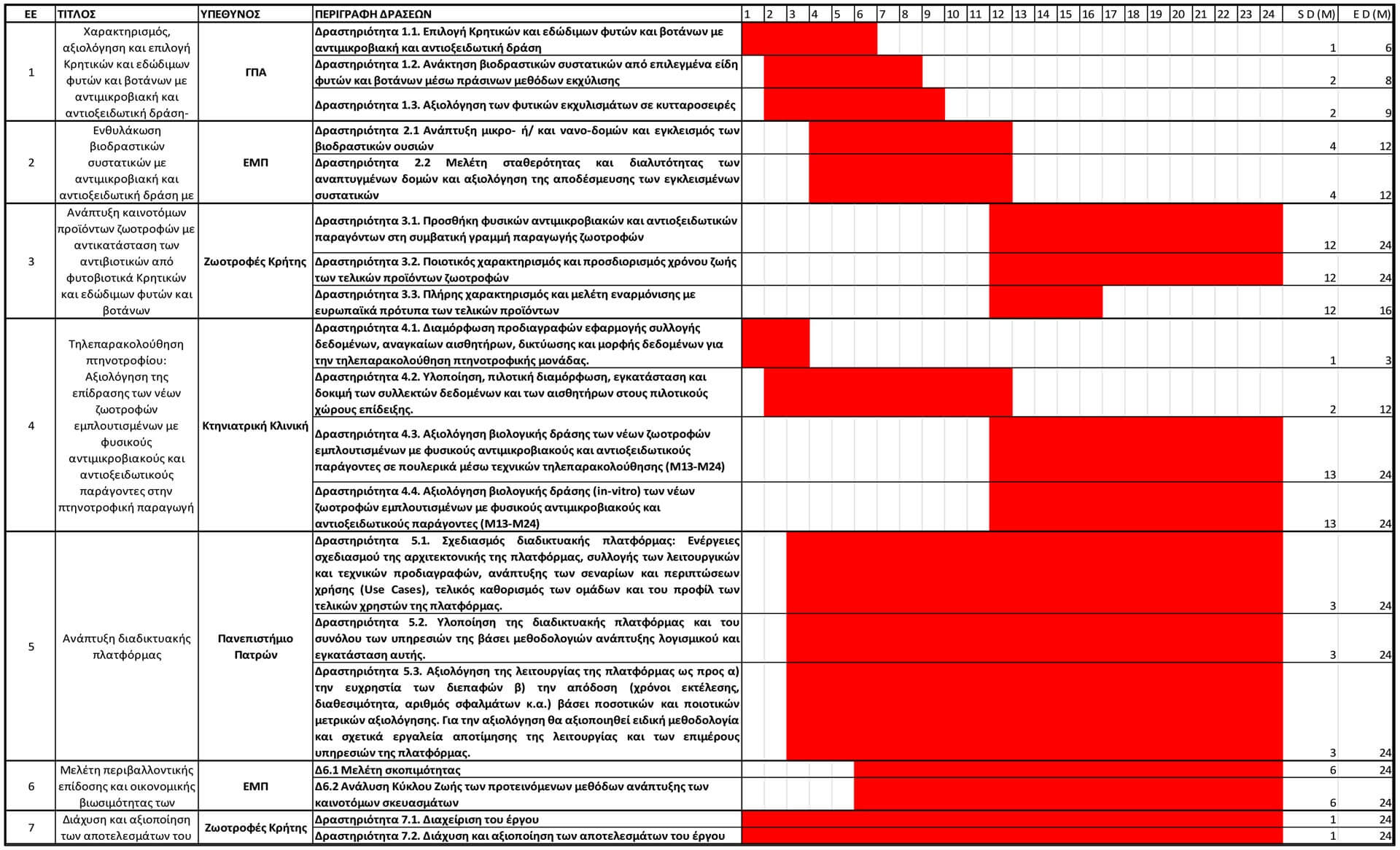 • Στην ΕΕ6, την οποία συντονίζει το Εθνικό Μετσόβιο Πολυτεχνείο με την ενεργή συμμετοχή των δύο εταιρείων Αγροκτημάτων και Ζωοτροφών Κρήτης, θα πραγματοποιηθεί τεχνοοικονομική ανάλυση και περιβαλλοντική αξιολόγηση των διεργασιών και προϊόντων μέσω ανάλυσης κύκλου ζωής με σκοπό τον εντοπισμό και την εξέταση των περιβαλλοντικών προβλημάτων καθώς και τη βελτιστοποίηση των διεργασιών, προκειμένου να ελαχιστοποιηθούν οι περιβαλλοντικές επιπτώσεις με λογικό κόστος. Ο συνολικός προϋπολογισμός της παρούσας ΕΕ ανέρχεται στα 45.746,67 ευρώ και η χρονική διάρκεια στους 18 μήνες.