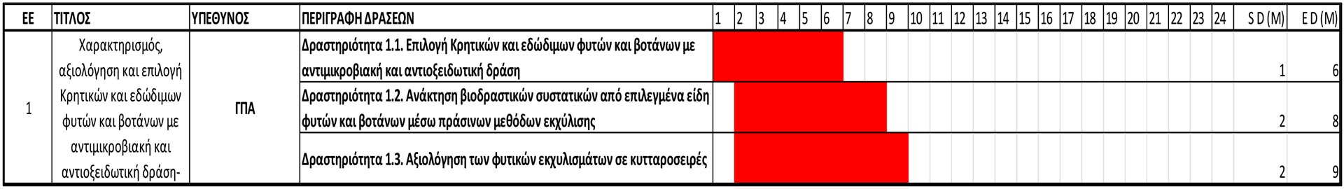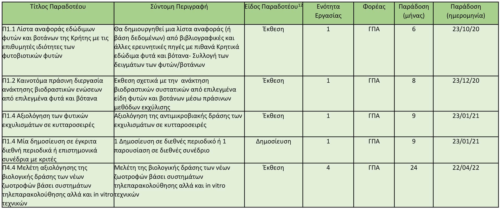 Στην ΕΕ1, η οποία συντονίζεται από το Γεωπονικό Πανεπιστήμιο Αθηνών και συμμετέχει το Εθνικό Μετσόβιο Πολυτεχνείο, θα πραγματοποιηθεί χαρακτηρισμός, αξιολόγηση και επιλογή Κρητικών και εδώδιμων φυτών και βοτάνων με αντιμικροβιακή και αντιοξειδωτική δράση τα εκχυλίσματα των οποίων θα χρησιμοποιηθούν ως πρόσθετα ζωοτροφών. Η ανάκτηση των βιοδραστικών ουσιών από επιλεγμένα φυτά και βότανα της Κρητικής γης θα πραγματοποιηθεί μέσω αποδοτικών, πράσινων μεθόδων, και τα φυτικά εκχυλίσματα που θα προκύψουν θα αξιολογηθούν σε νεαρά κοτόπουλα με κλινικά συμπτώματα διάρροιας μέσω βακτηριακών αναλύσεων με 16S rRNA τεχνικές αλληλουχίας. Έμφαση θα δοθεί στην ανάλυση φυτοβιοτικών με δράσεις που θα έχουν υποδειχθεί ως αναγκαίες από τα Αγροκτήματα Κρήτης που αναλαμβάνουν την εκτροφή των ζώων. Ο συνολικός προϋπολογισμός της παρούσας ενότητας εργασίας ανέρχεται 82.200 ευρώ και η χρονική διάρκεια στους 8 μήνες.