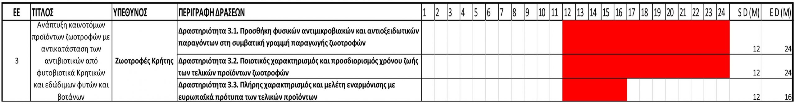Στην ΕΕ3, η οποία συντονίζεται από τις Ζωοτροφές Κρήτης και συμμετέχουν ενεργά τα Αγροκτήματα Κρήτης και το Εθνικό Μετσόβιο Πολυτεχνείο, θα ενσωματωθούν οι εγκλεισμένοι και μη αντιμικροβιακοί και αντιοξειδωτικοί παράγοντες στη συμβατική γραμμή παραγωγής ζωοτροφών. Στα τελικά προϊόντα για τη διατροφή των πουλερικών θα αξιολογείται το βιοδραστικό περιεχόμενο, η σταθερότητα και η διάρκεια ζωής. Επιπλέον, στα πλαίσια της παρούσας δραστηριότητας θα πραγματοποιηθεί ενδελεχής μελέτη της Ευρωπαϊκής κι Εθνικής νομοθεσίας σχετικά με την ποιότητα και τις προδιαγραφές των ζωοτροφών ώστε να επικυρωθεί η πλήρης εναρμόνιση των παραγόμενων με τις κοινοτικές προδιαγραφές. Ο συνολικός προϋπολογισμός της παρούσας ενότητας εργασίας ανέρχεται 70.573,33 ευρώ και η χρονική διάρκεια στους 12 μήνες.