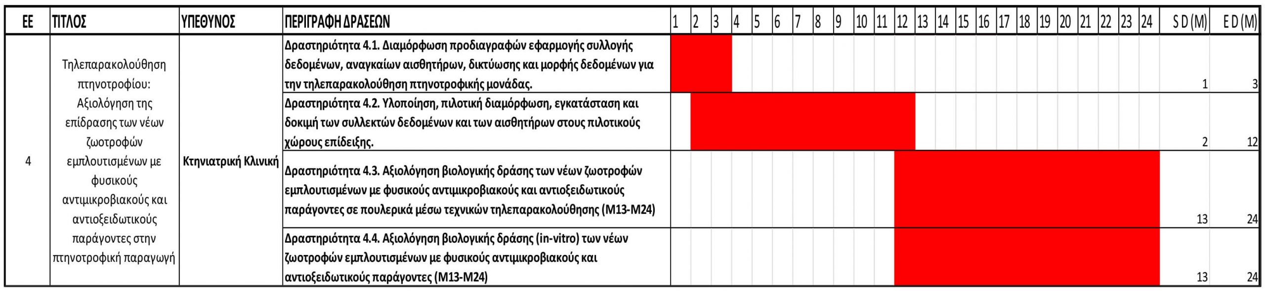 Στην ΕΕ4, η οποία συντονίζεται από την Κτηνιατρική Κλινική με την ενεργή συμμετοχή των Αγροκτημάτων Κρήτης, των Ζωοτροφών Κρήτης, του Γεωπονικού Πανεπιστημίου Αθηνών και του Πολυτεχνείου Πατρών, θα αναπτυχθεί η τεχνολογία τηλεπαρακολούθησης πτηνοτροφίου. Το συγκεκριμένο σύστημα θα εφαρμοστεί στην πτηνοτροφική μονάδα για την παρακολούθηση σε πραγματικό χρόνο της επίδρασης των καινοτόμων ζωοτροφών στην κλινική εικόνα των πουλερικών. Συγκεκριμένα, θα αξιοποιηθούν οι δυνατότητες Internet of Things (ΙοΤ) για τη συλλογή δεδομένων από το πτηνοτροφείο, τα οποία θα διατίθενται στην διαδικτυακή πλατφόρμα, που θα αναπτυχθεί στο πλαίσιο της ΕΕ5. Ο συνολικός προϋπολογισμός της παρούσας ενότητας εργασίας ανέρχεται 265.980 ευρώ και η χρονική διάρκεια στους 11 μήνες.